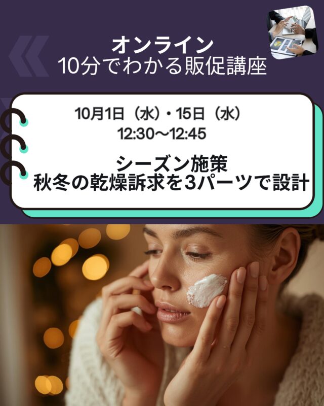 秋冬の販促に欠かせないテーマといえば「乾燥対策」。本セミナーでは、シーズン特有のニーズに応えるための販促設計を 「3つのパーツ」 に分けてわかりやすく解説します。具体的には、①お客様の心をつかむ訴求ポイント、②購買意欲を高める売場・オンラインでの表現方法、③リピートにつなげるアフターフォロー施策の3段階で整理。限られた時間の中で、実践にすぐ使える販促アイデアと設計の考え方をお伝えします。秋冬商戦に向けて、乾燥訴求を効果的に展開したい方に最適の10分間です。