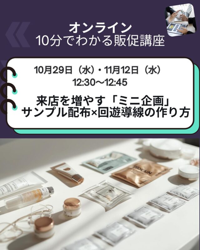 来店数を増やすには、大掛かりなキャンペーンだけでなく「小さな仕掛け=ミニ企画」が効果的です。本セミナーでは、サンプル配布を入口にしてお客様を惹きつけ、店内の回遊導線を自然に作り出す実践方法を解説します。10分で「なぜサンプルが来店動機になるのか」「どのように配置や導線を設計すれば購買につながるのか」を具体事例を交えながら学べます。明日からすぐに使える小規模で効果的な販促のヒントをお届けします。